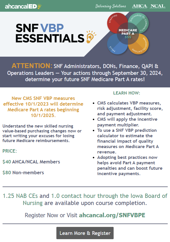 From our national affiliate, AHCA/NCAL: Important education on Medicare Part A Value Based Purchasing and Recent Changes to the Program Posted in Medicare, Skilled Nursing « Prev Article Next Article »